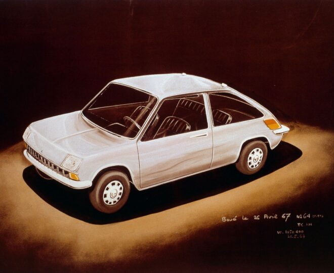 Then, the designers moved on to a graphic palette to define proportions, contours, the distance between the headlights, to find the expression, the smiling look of the 1970s R5.