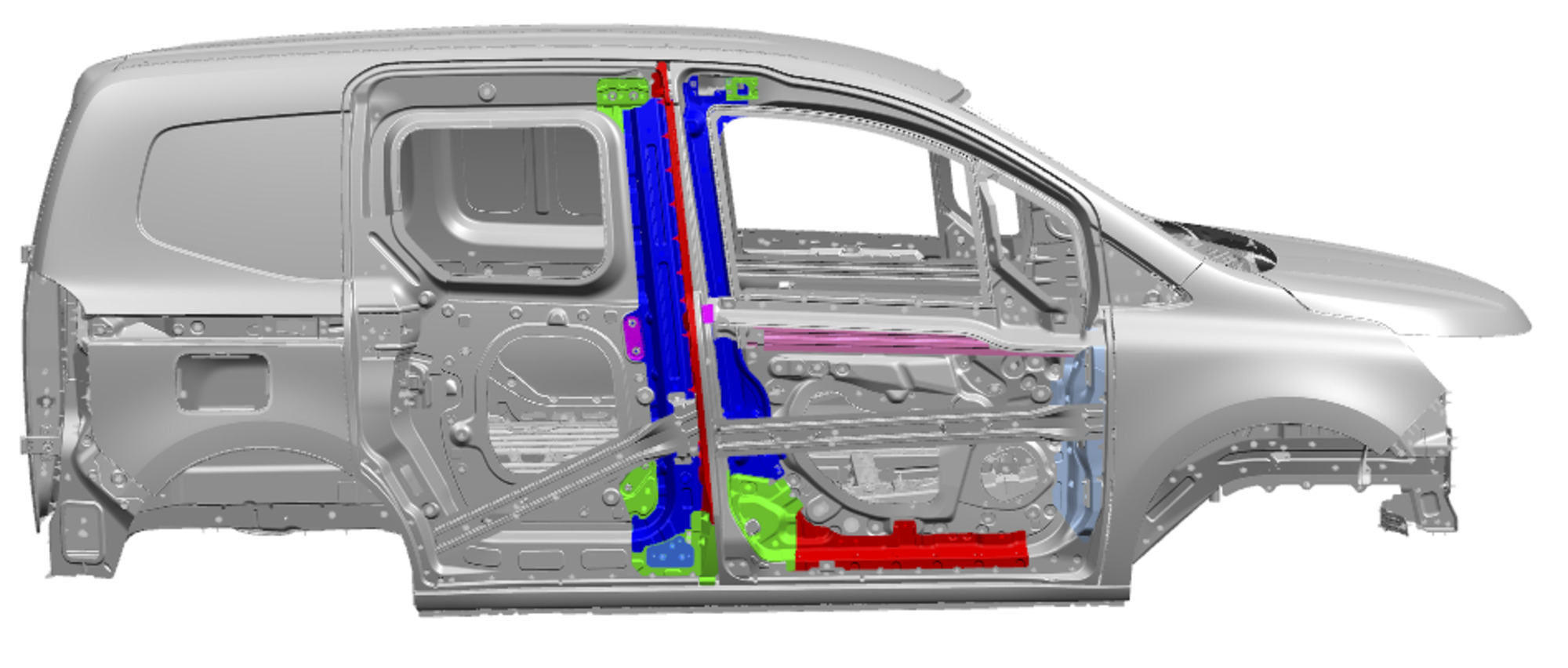 The challenge was like nothing the engineering team had ever taken on before: it was the first time they had to design a vehicle without a centre pillar. This involved revamping the vehicle’s architecture and repositioning all the parts that are fastened in one way or another to the centre pillar. For example, they transferred the locks to the top and bottom of the vehicle, so the doors can be anchored to the body. The passenger seatbelt has switched sides. But the most important new features are the nine purpose-built stiffeners that were added to the doors so they can withstand side knocks.